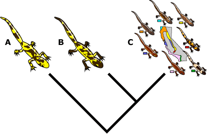 Neste exemplo, As linhagens A e B de salamandras Ensatina são espécies distintas. Cada uma tem um ancestral comum que indivíduos de outras espécies não têm. Mesmo que tenha se diversificado muito, a linhagem C é uma espécie única, de acordo com o conceito filogenético de espécies. Nenhuma das subespécies da linhagem C tem um único ancestral em comum separado de outras subespécies.