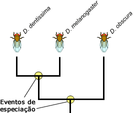 Definindo EspeciaçãoA especiação é um evento de separação da linhagem que produz duas ou mais espécies distintas. Imagine que você esta olhando para a ponta da árvore da vida que constitui uma espécie de mosca da fruta. Siga a filogenia para onde o galho da sua mosca de fruta se conecta ao resto da árvore. Esse ponto de ramificação e todos os outros pontos de ramificações são eventos de especiação. Em que ponto mudanças genéticas resultaram em duas linhagens de moscas de fruta distintas, onde anteriormente havia sido apenas uma linhagem. Mas como e por que isso aconteceu? ![]() Os pontos de ramificação desta filogenia parcial de Drosophila representam eventos de especiação há muito passadas. Aqui esta um cenário que exemplifica como a especiação pode acontecer: