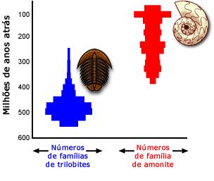 Isso significa que olhando para trás no registro fóssil, vemos muitas linhagens diferentes de trilobites e amonites, mas poucas que resistiram por longos períodos de tempo geológico. E é claro, para ambos os clados, em longo prazo, a extinção ocorreu mais frequentemente o que a divergência de espécies, com o resultado de que ambos estão extintos hoje.