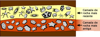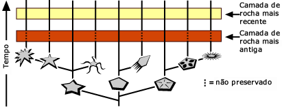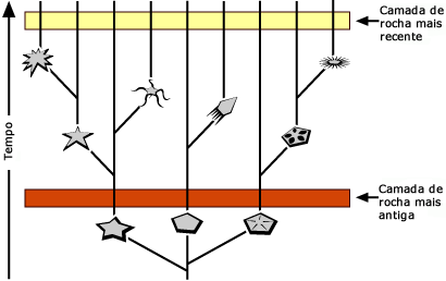 Interpretando a EvidênciaVocê poderia pensar que descrever o “o que aconteceu quando” nas mudanças macroevolutivas seria algo fácil de fazer. Mas não é tão fácil quando você está lidando com eventos que aconteceram há muito tempo e uma história que nós não vimos e que não pode se repetir. Por exemplo, imagine um paleontólogo examinando fósseis das duas camadas de rochas adjacentes representada abaixo. Na camada mais antiga, há apenas alguns equinodermas (o clado que contém as estrelas e ouriços do mar). Na camada mais recente há muitas espécies de equinodermas com formas de corpo muito distintas. Essas camadas de rocha nos apresentam imagens instantâneas da vida através do tempo e nosso trabalho é preencher o que aconteceu entre as imagens.