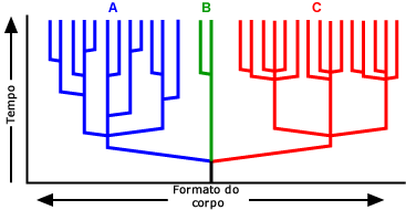 Divergência de linhagens (ou especiação): Padrões de formação de linhagens podem ser identificados ao construir e examinar uma filogenia. A filogenia pode revelar que uma linhagem em particular tenha sofrido especiações incomumente frequentes, criando um tufo espesso de ramos na árvore (clado A, abaixo). Pode também revelar que a linhagem tem uma baixa taxa de divergência de linhagens, representada por um longo ramo com poucos galhos saindo dele (clado B, abaixo). Ou pode revelar que várias linhagens passaram por uma “explosão” de divergências ao mesmo tempo (clado C, abaixo).