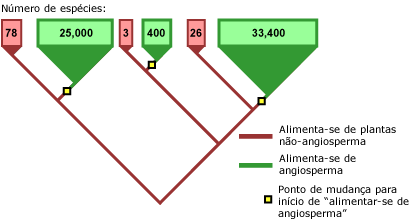Como se explica tantos besouros? Brian Farrell (1998) realizou um estudo filogenético que ajuda a responder essa questão. Ele reconstruiu a filogenia de todos os principais grupos de besouros e observou suas características alimentares. Essa pesquisa permitiu inferir o que os besouros ancestrais provavelmente comiam e quando a linhagem mudou para um novo tipo de comida. Suas evidências sugerem que linhagens diferentes de besouros mudaram para alimentar-se de plantas com flores (angiospermas) várias vezes durante suas histórias evolutivas. Para entender o que aconteceu quando essas mudanças ocorreram, Farrell comparou táxons irmãos, clados que são mais próximos entre si. Ele viu o mesmo padrão de novo e de novo (como apontado na representação abaixo): a linhagem que mudou para angiosperma sofreu especiações frequentes e se tornou muito diversa, enquanto a linhagem que não mudou tinha uma taxa menor de especiação e não se tornou muito diversa. “Alimentar-se de angiospermas” é associado com altas taxas de especiação (ou baixas taxas de extinção – é difícil dizer). O que torna essa conexão entre alimentação e diversidade tão convincente é que ela se mostra várias vezes na evolução dos besouros – a natureza replicou o experimento várias e várias vezes.